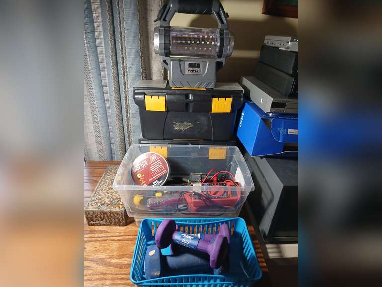 LOT 108 - Small storage organizer, ohms meters, pocket knife, 2# hand weights