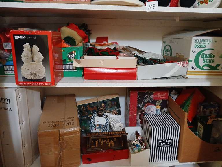 LOT 120 - Nice assortment Christmas items including Nativity set, 14" tall tangled up Santa, white father christmas, Danbury falls globe, tree decorations