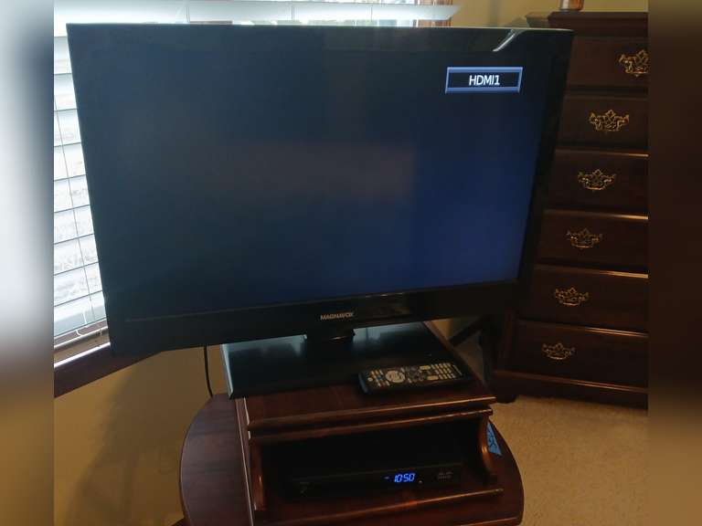 LOT 53 - Magnavox 32" flat screen TV on homemade cherry swivel base. Comes with remote and powers on
