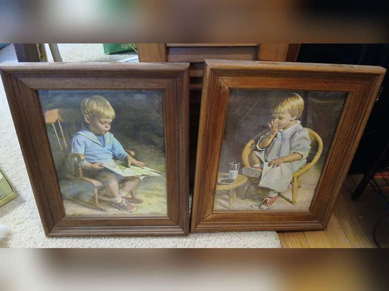 LOT 62 - Gretchen & Gary Ingwersen Wood Framed Boy Rocker And Girl Eating Cookies, 19x15