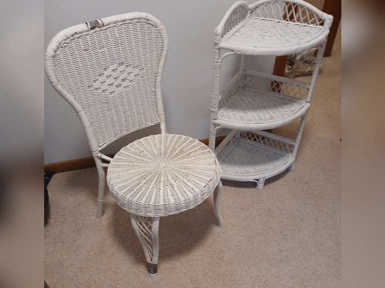LOT 75 - White wicker chair & corner shelf. 30"H