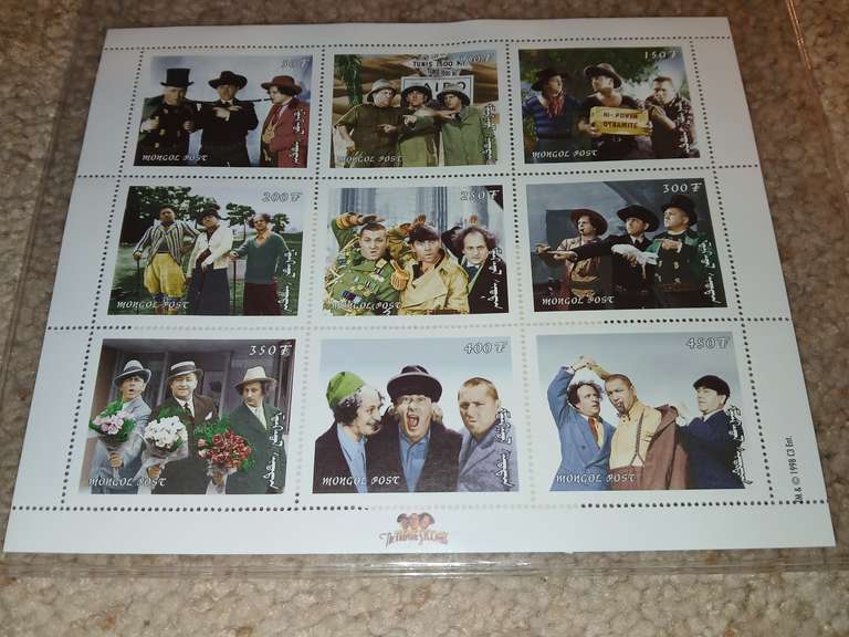 LOT 87 - The Three Stooges "At their Best" plates block of 9 collector stamps. Certificate of Authenticity