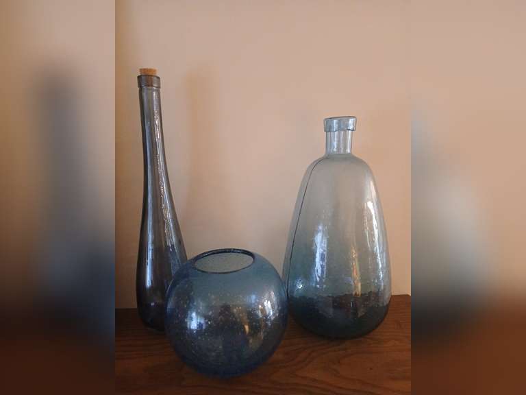 LOT 98 - Blue to clear bubble design fish bowl, 14" jug and 19" bottle with cork