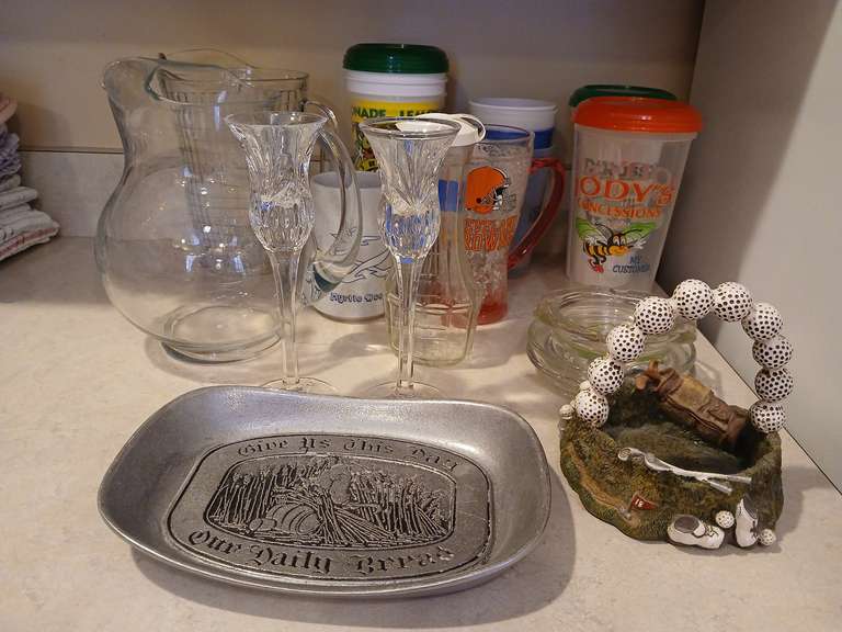 LOT 108 - Glass pitchers, cups, aluminum tray, stemware, ashtrays, golf basket