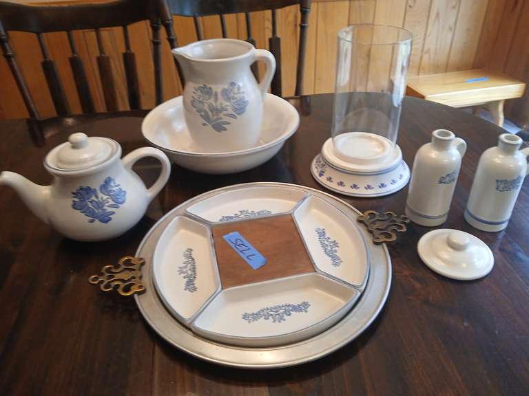 LOT 109 - Pfaltzgraff dinnerware large assortment including (7) dinner plates, (7) snack plates, (6) soup bowls, large salt, pepper, creamer and sugar, bean pot, casserole bowl, lazy susan, teapot, pitcher and more. (18) 4-6" wine goblets