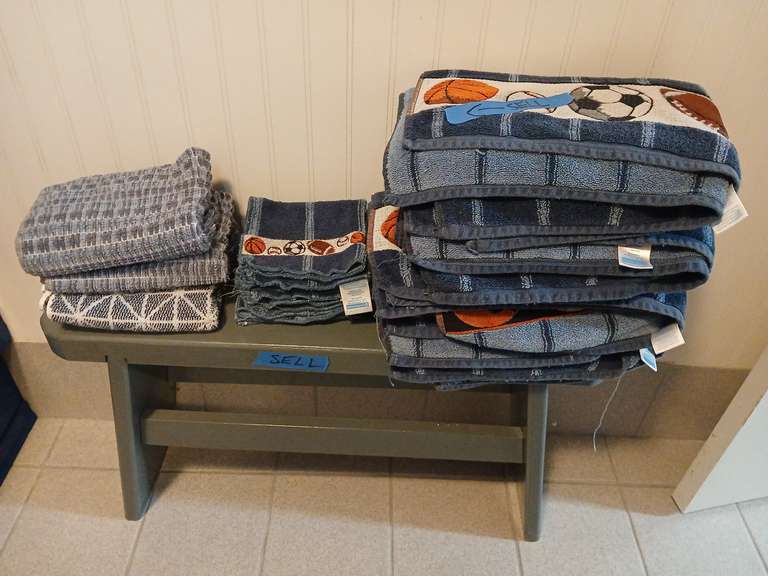 LOT 163 - Sports themed bath towels and wash cloths, wood bench, bath mat