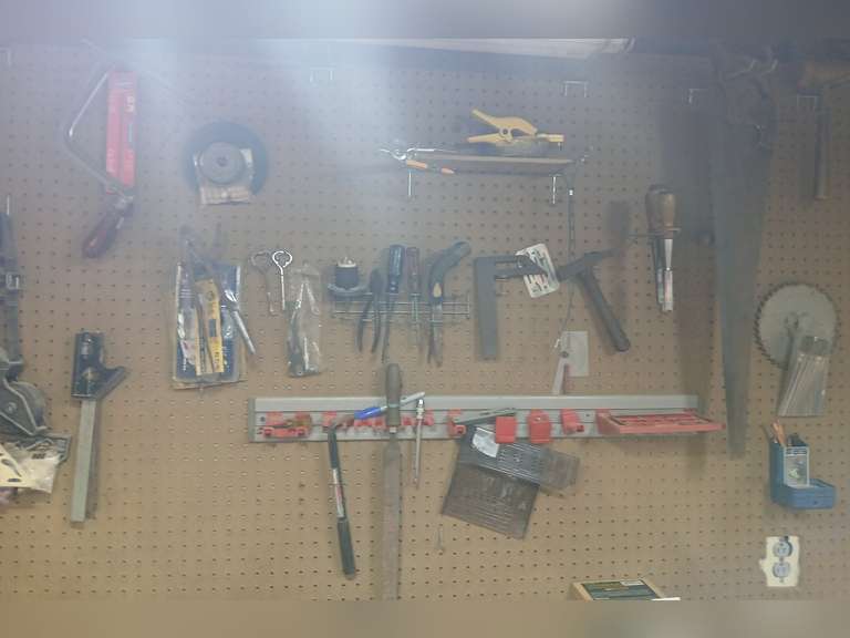 LOT 43 - Pegboard contents including hammer, handsaw, chisel, screwdrivers, other tools