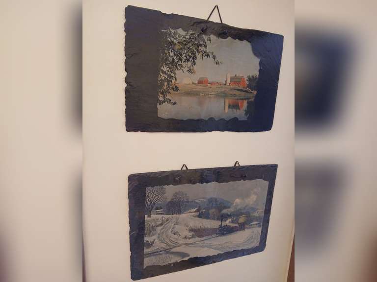 LOT 160 - (2) Pieces slate artwork depicting The Farm & Winter Train. 20"x14"