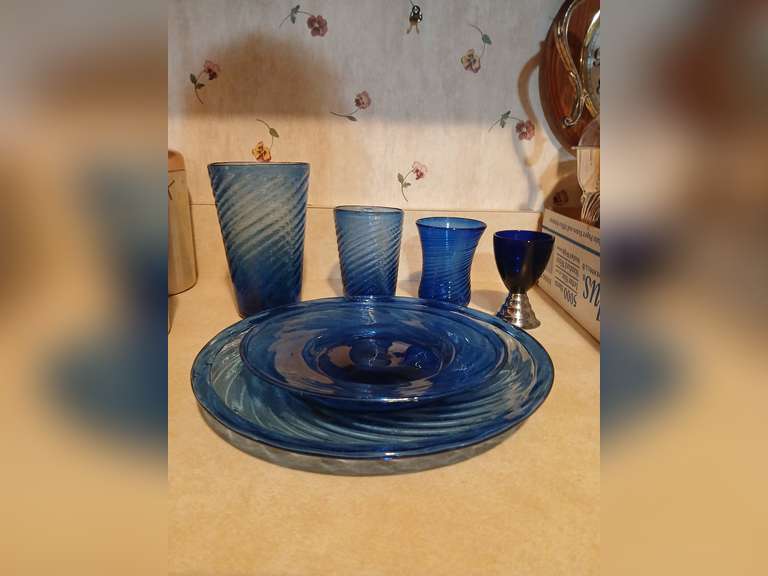 LOT 166 - Cobalt blue plates, bowl, glasses, stemware, creamer & sugar