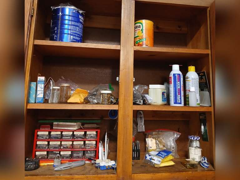 LOT 235 - Contents cabinet shoe rivets, organizer, assorted hardware