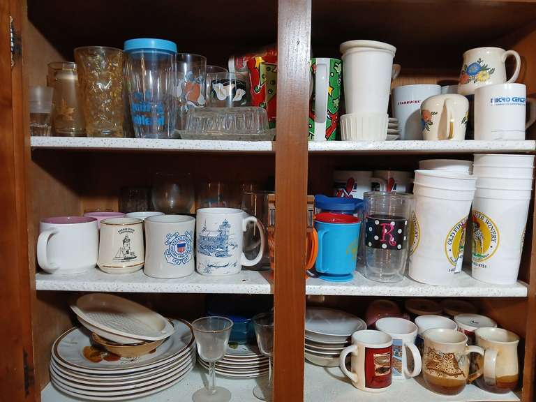 LOT 179 - Cupboard contents, amber glass & frosted glass mugs, Cleveland Indians coffee mugs, assorted stoneware bowls, cups & more