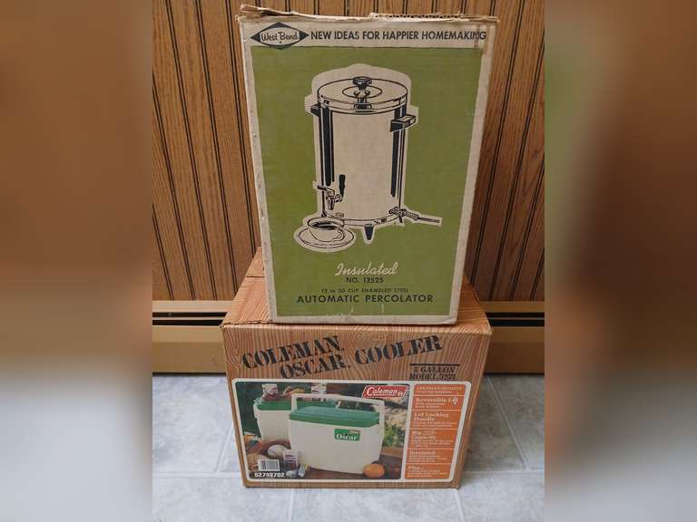LOT 207 - Coolers, West Bend coffee pot, picnic basket