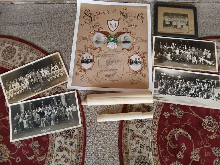LOT 229 - Unique Group Of Early Photographs including St. Mary's school Diploma from 1914. American sportsmen show from 1945-1948. American flag framed children art and Souvenir Noces Dor poster art