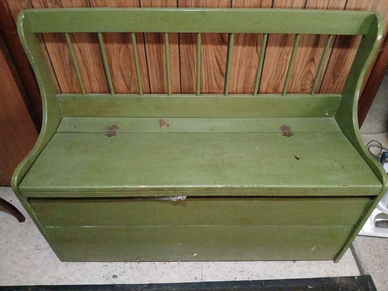 LOT 239 - Painted green flip top bench. Includes contents tarps, snow brush. 48"w
