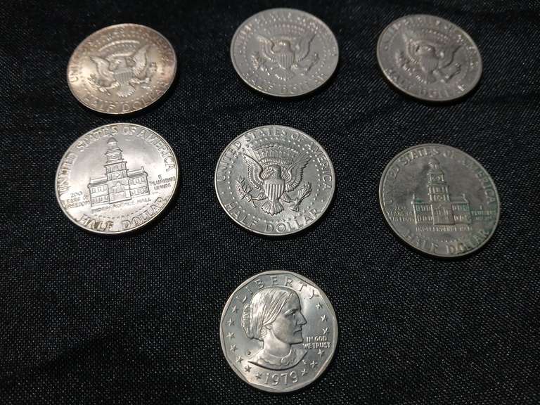 LOT 128 - (6) Half dollars & (1) Susan B Anthony One dollar coin