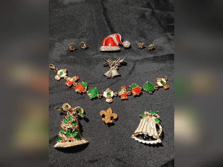 LOT 137 - Santa Hat pin with christmas tree & wreathe earrings, christmas themed bracelet and bells