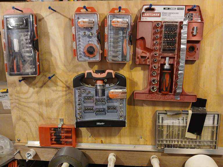 LOT 327 - Wall contents including New tool sets, Craftsman Stubby wrench socket set, Husky 16pc precision knife set, iWork t handle ratchet sets, finger ratchet set and precision knife set and mini screwdriver sets