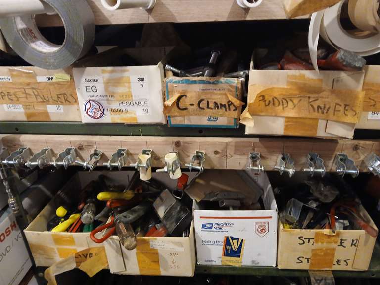 LOT 328 - 2 shelves including crescent wrenches, screwdrivers, C clamps, scrappers, buddy knives, tapes and rulers