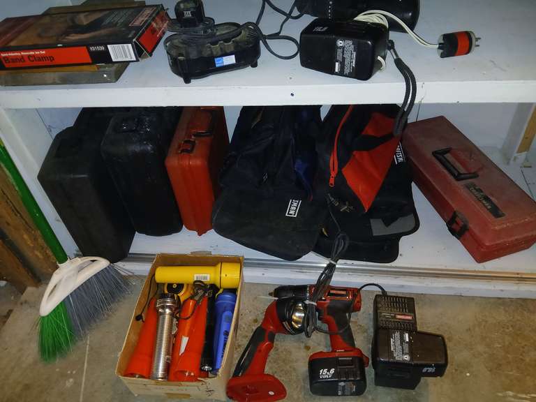 LOT 343 - Cordless drill, flashlights, empty tool cases & bags, band clamp
