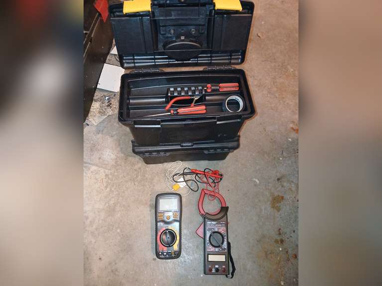 LOT 332 - Voyager 12" tool boxes with Cen Tech digital clamp meter, Craftsman multimeter and screwdrivers. X2
