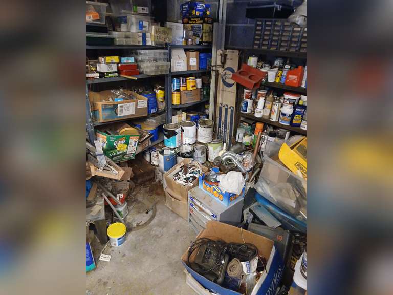 LOT 346 - Large lot home repair parts, cleaners, stains, paints, organizers, lamp