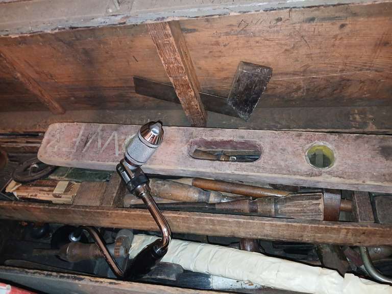 LOT 348 - Flip top tool box with earlier hand tools, chisels, screwdrivers, rasps & more