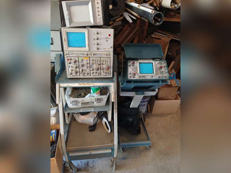 LOT 351 - Tektronix 455 dual-channel analog oscilloscope, Textronix 7704 A oscilloscope system on tek lab cart, Tektronix 606B monitor