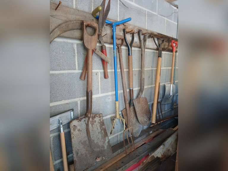 LOT 366 - Group yard tools, shovels, garden claws, pitch forks