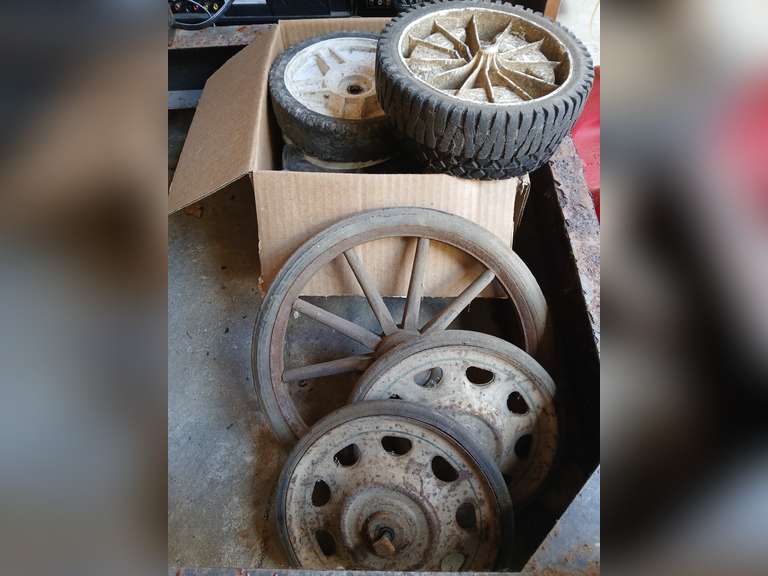 LOT 378 - Group of wheels including wooden spoke wagon wheel, other wheels.