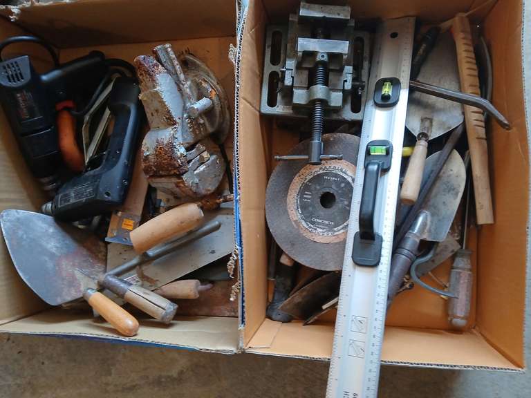 LOT 381 - Lot 24" level, garden tools, Craftsman 3/8" drill, table vise, mini vise, crowbar and more
