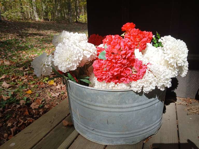 LOT 406 - Galvanized wash tub with assorted flower decor