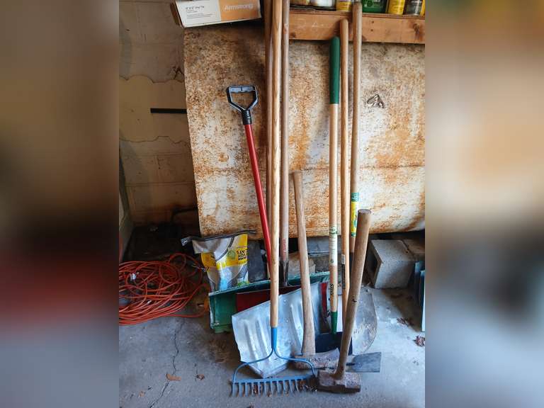 LOT 421 - Lot garden and snow shovels, Ames scraper, rake, axe, sledge hammer