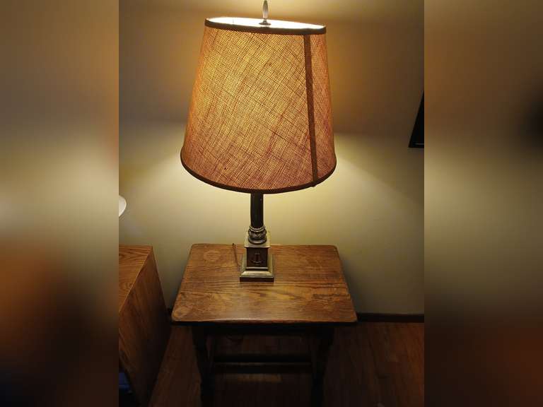 LOT 54 - (2) solid wood night stands with harp design brass table lamp (33"H) and Clear glass flower design table lamp and marble container, spectra TV and other books