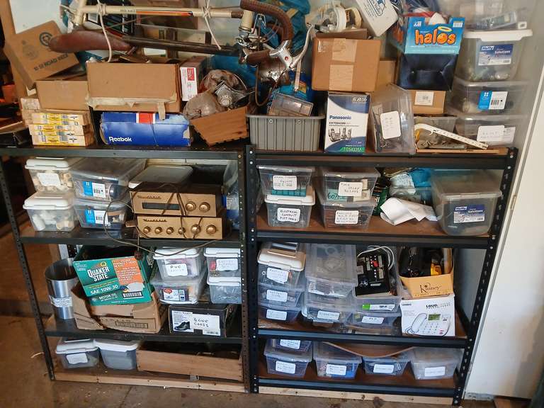 LOT 435 - Shelf contents including electrical conduit fittings, relays, heathkit stereos, aluminum flashing, copper fittings, hardware molex and more