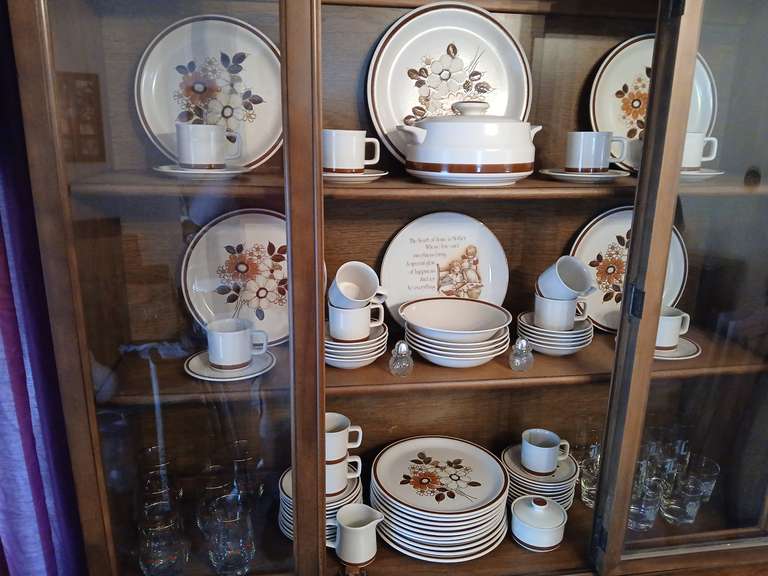 LOT 5 - The WoodHaven Collection "Pleasant Grove" Pattern dinnerware set with (6) gold rimmed tumblers and other clean tumblers