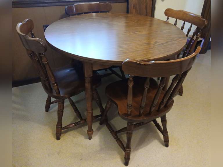 LOT 18 - Made in Yugoslavia 42" round dining table with 4 spindle back chairs, 12" W leaf