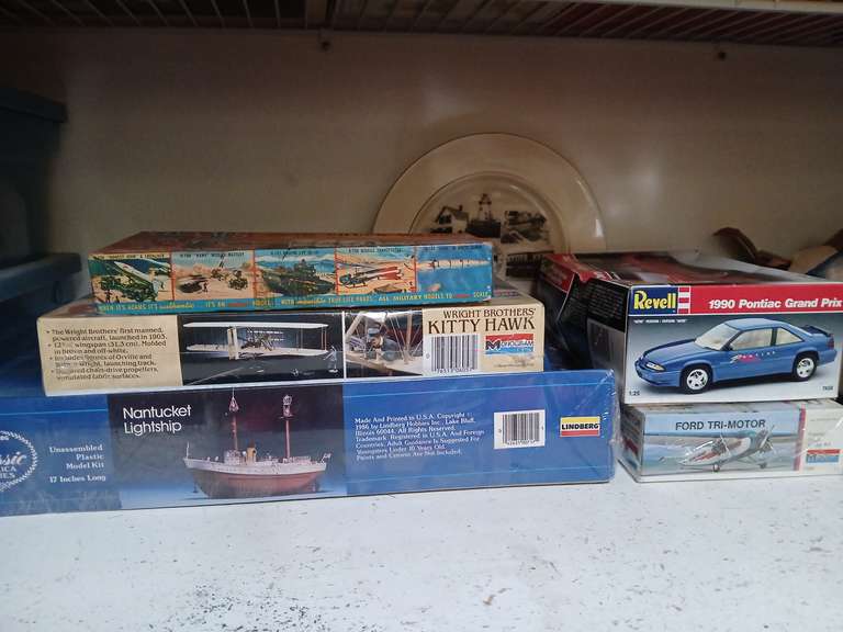 LOT 64 - Shelf lot models by Revell 1990 Pontiac Grand Prix, Nantucket Lightship NIB, Wright Brothers Kitty Hawk, baseball caps