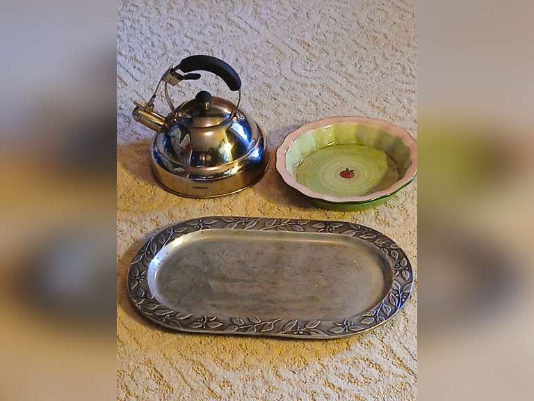 LOT 32 - Wilton pewter serving tray, pie plate and tea kettle