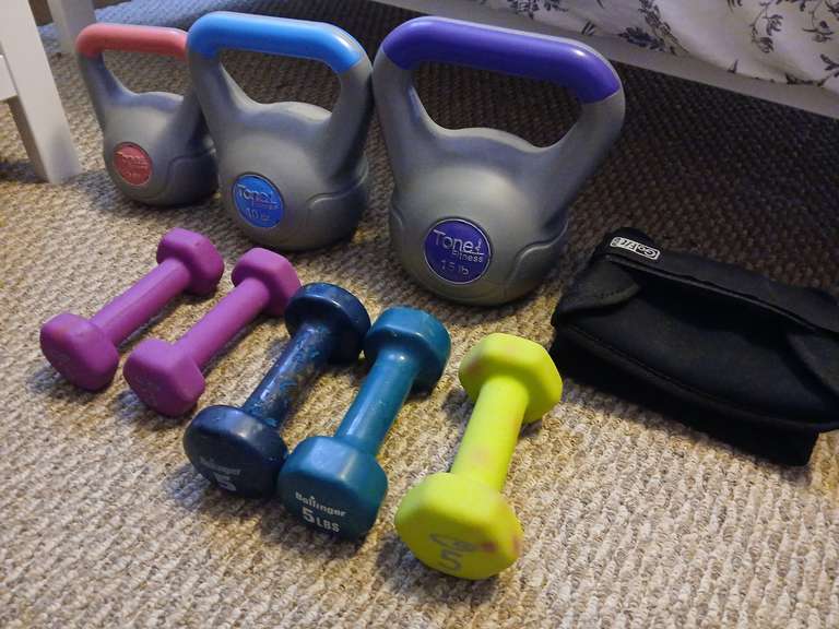 LOT 54 - Fitness Equipment including Tone 5,10,15lb kettlebells, pair 3lb and 5lb dumbells and gofit ankle we