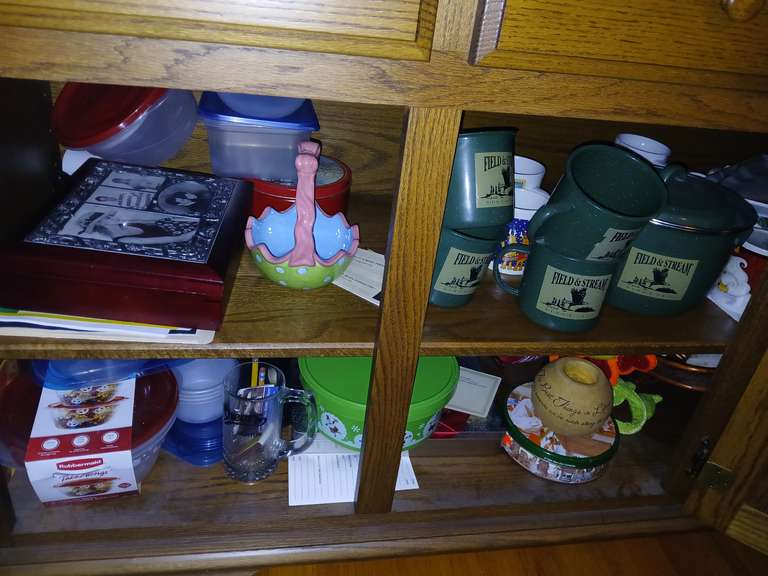 LOT 44 - Contents of side server: plates, cups, Field & Stream enamel cups, plasticware