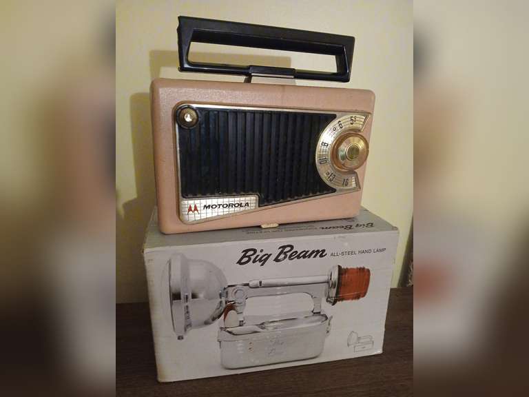 LOT 69 - Vintage Motorola radio and Big Beam steel hand lamp in original box. Note: handle on radio needs repair