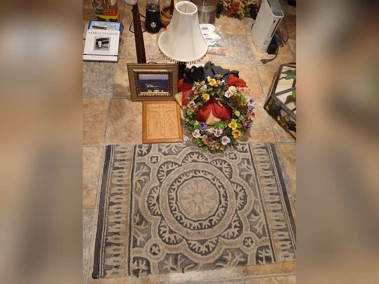 LOT 91 - Lot wreaths, religious picture, shoe last, small table lamp, throw rug