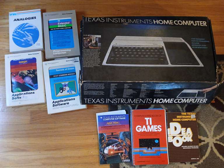 LOT 70 - Texas instruments home computer model TI-99 in original box with assorted software, analogies, programs and game books