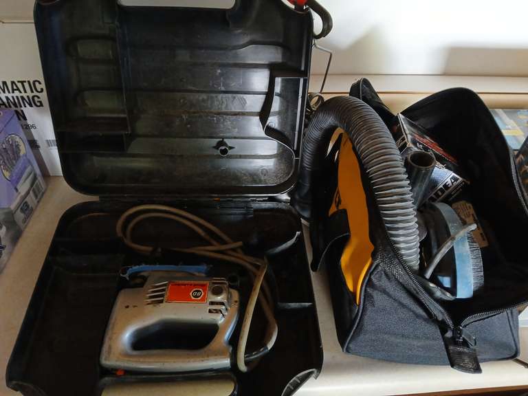 LOT 124 - B&D jig saw in hardback case, sanding tool with diamond polishing pads in Dewalt carry bag
