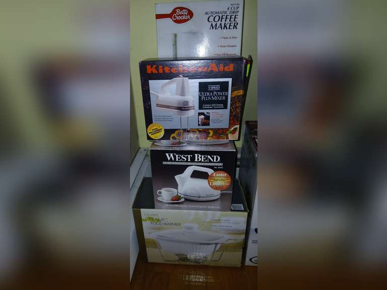 LOT 48 - Kitchen Aid ultra power hand mixer, Betty Crocker 4 cup coffee maker, West Bend pot, Square ceramic food warmer, hot plate