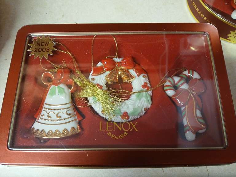 LOT 142 - Lenox 2003 tin box set. Bell, wreathe, candy cane. NIB