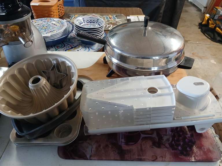 LOT 181 - Electric skillet, muffin tins, bundt pan, slicer, wine cutting boards, pizza paddle