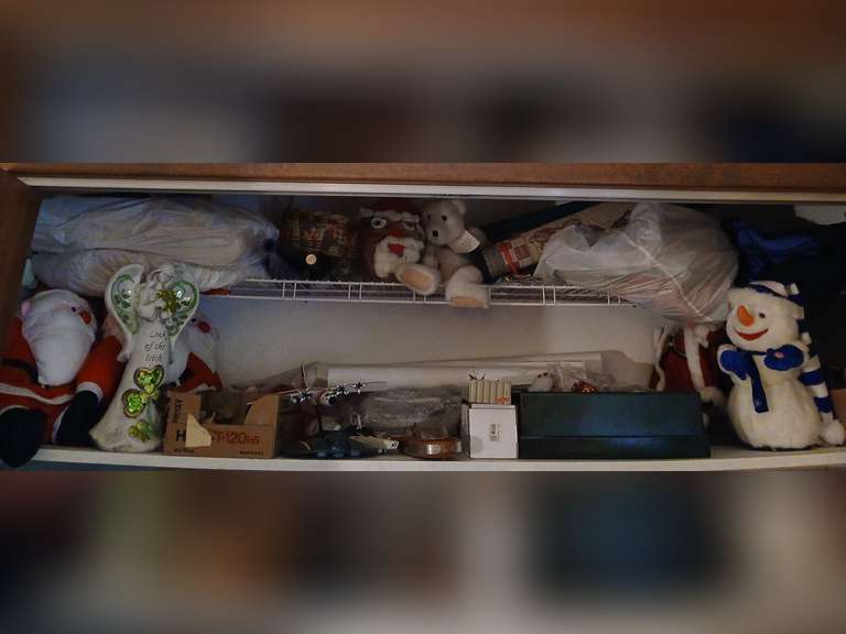 LOT 82 - Contents 2 shelves Christmas plush, Irish statue, Star Wars vehicles, model plane, travel bag, throw rugs