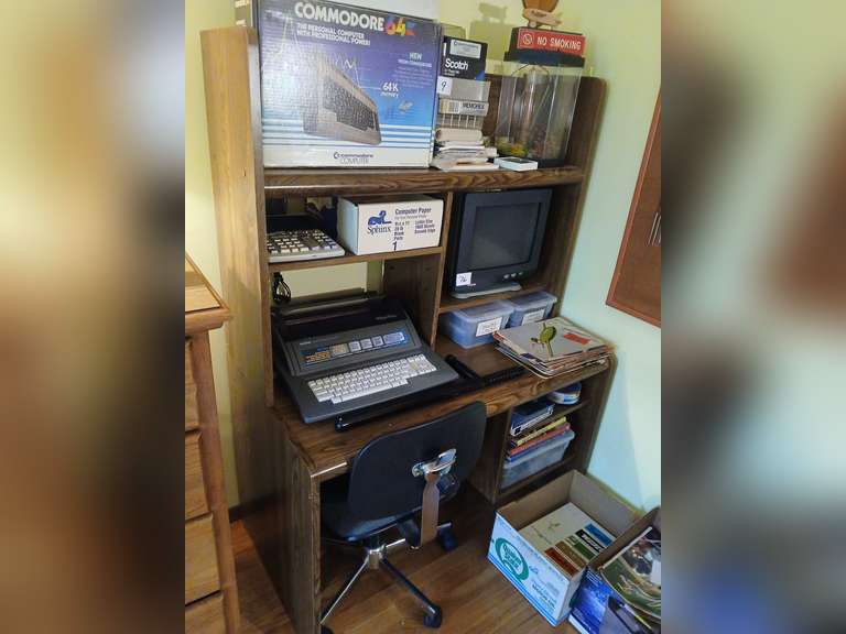 LOT 77 - Solid wood computer desk, measures 41"w x 22"d x 59"h. Also comes with computer chair & matching printer stand with other contents. Note: Commodore and brother lots not included.