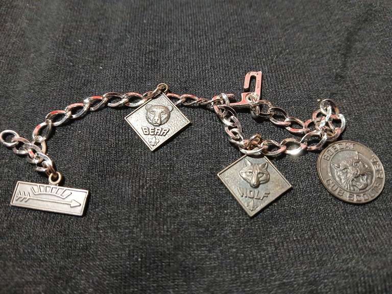 LOT 283 - Vintage Early Cub scouts Sterling Silver "Bear, Wolf, BobCat and arrow charm bracelet". All marked Sterling